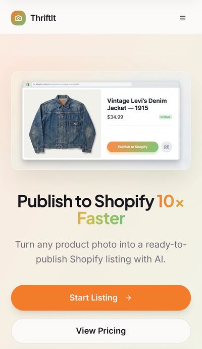 ThriftIt.ai is a web application that transforms product photography into complete Shopify listings in seconds using artificial intelligence.